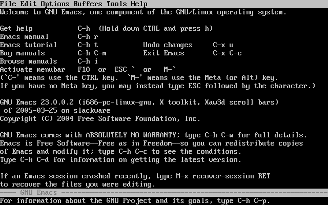 There are two main versions of Emacs: GNU Emacs (which is the version that comes with Slackware) and XEmacs. The latter is not a version for Emacs running under X. In fact, both Emacs and XEmacs run on the console as well as under X. XEmacs was once started as a project to tidy up the Emacs code. Currently, both versions are being actively developed, and there is in fact much interaction between the two development teams. For the present chapter, it is immaterial whether you use Emacs or XEmacs, the differences between them are not relevant to the normal user.